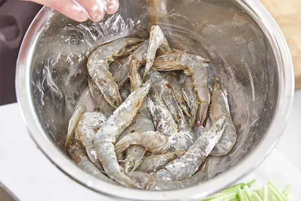 3. 在虾皮表面均匀地撒上一层薯粉,也可以用淀粉代替。