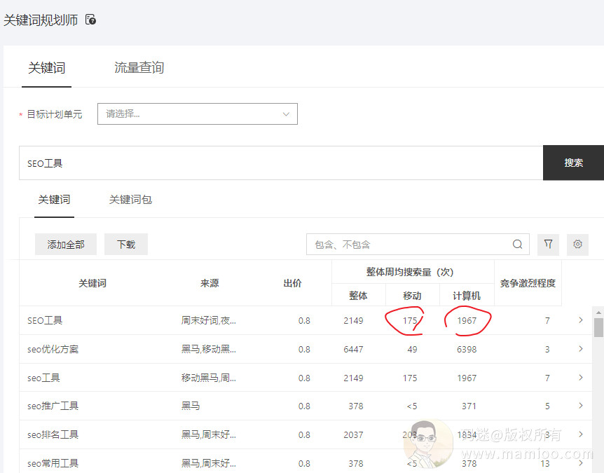 我们通过百度凤巢后台,可以看到,【SEO工具】计算机端远远大于移动端,一般这种情况快速排名干扰导致。因为快排的原因,竞争还是相对激烈。